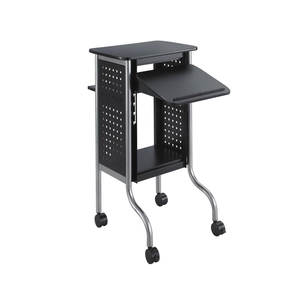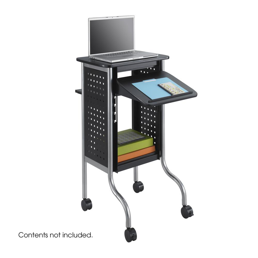 Scoot Presentation Cart provides three platforms for the perfect presentation combination. The stylish multi-platform cart has the ability to hold a laptop, LCD screen and projector to support both current and future technological advancements. Design also features a height-adjustable shelf at a convenient, 15-degree tilt that is adjustable in 2-3/4'' increments in four positions - from 24-1/2'' to 32-3/4''. The bonus bottom shelf gives the added luxury of storage on the go. Presentation cart rolls smoothly on four 3'' casters (two locking).