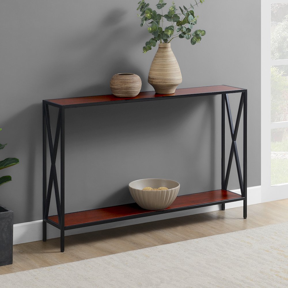 The Tucson Console Table with Shelf by Convenience Concepts is a beautifully versatile piece, merging farmhouse charm with modern, industrial style. Designed to fit seamlessly into any space, it serves as an ideal entryway table, hall table, sofa couch table, or classic console table. This adaptable piece offers a spacious tabletop for displaying treasured decor or storing everyday essentials, while the additional bottom shelf provides even more room for books, baskets, or decorative accents. Crafted with a sturdy, powder-coated metal frame, this table ensures durability and stability, while the manufactured wood shelves come in a variety of gorgeous finishes to suit any interior. The table is quick to assemble and includes anti-tip hardware for added safety. With its blend of rustic charm and modern appeal, the Tucson Console Table with Shelf is both functional and eye-catching, perfect for completing a cozy farmhouse-inspired space. Pair this chic piece with coordinating pieces from the Tucson Collection, each sold separately.