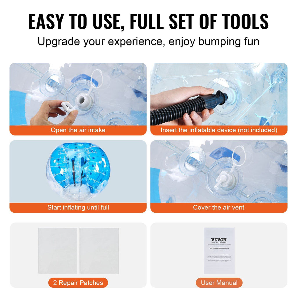 1.High-quality Material, Endless Fun: Dive into endless bumping fun with VEVOR 2-Pack Inflatable Bumper Balls! Crafted from 0.8mm thickened, explosion-proof PVC, these sumo balls are durable, safe, waterproof, and built to prevent air leaks. Excellent tear resistance, advanced valve system and tight sealing promise long-lasting entertainment.