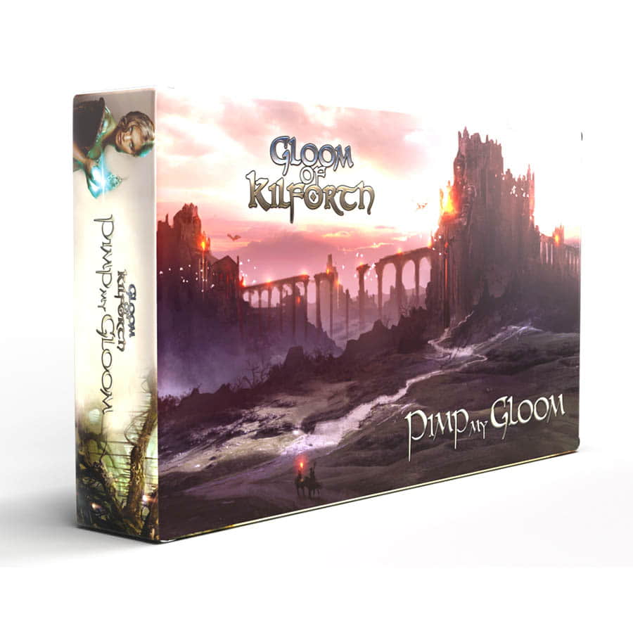 Gloom of Kilforth: Pimp My Gloom is an upgrade pack that includes a bigger velvet bag, More Dice - 6 white, 6 black, 16 Race Art Standees, 8 of each gender plus 16 plastic stands, 4 Ancients standees plus 4 plastic stands, Replacement Larger (tarot-sized 121mm x 70mm) Location cards with black and white Gloom sides, Player Aid cards