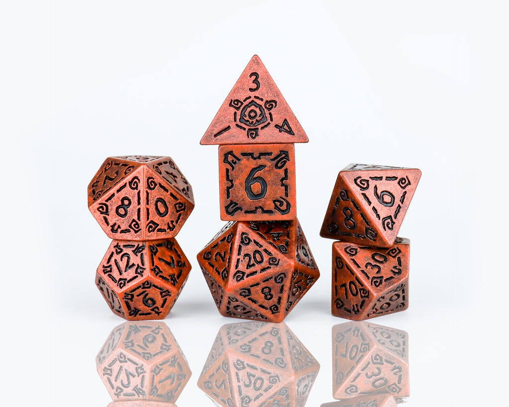 Our Illusory Metal dice look like metal but have the great weight and feel of resin! Each set features glyphs and numbers with a vintage feel. This Copper set features a set of 7 polyhedral dice packaged in a windowed tin, so you can easily carry and store your dice.