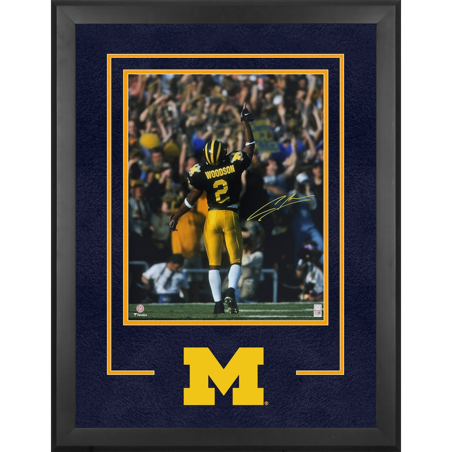 Charles Woodson Michigan Wolverines Autographed Deluxe Framed 16'' x 20'' Pointing Up Photograph - Signature in Yellow Ink