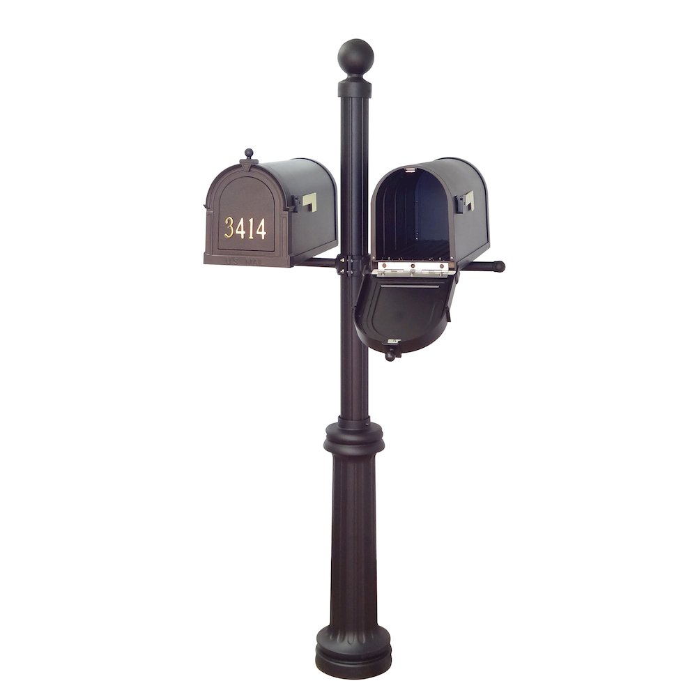 The Berkshire Curbside Mailbox presents an impressive face. The one piece cast aluminum door features deeply cut details with a rich, leather grain textured panel. The stainless steel spring hinge and magnetic catch will keep the door secure and the rust proof cast aluminum body construction creates a weather resistant mailbox. Also includes up to five 2 inch tall brass self adhesive address numbers per mailbox.Two mailboxes are included with this combination.This Fresno Double Mount Direct Burial Mailbox Post is made of durable cast and extruded aluminum with a powder coated finish for a lifetime of beauty. 3'' outer diameter x 76'' H Fluted Post. Includes decorative mailbox double mounting bracket and cannon ball post topper and wrap around base.