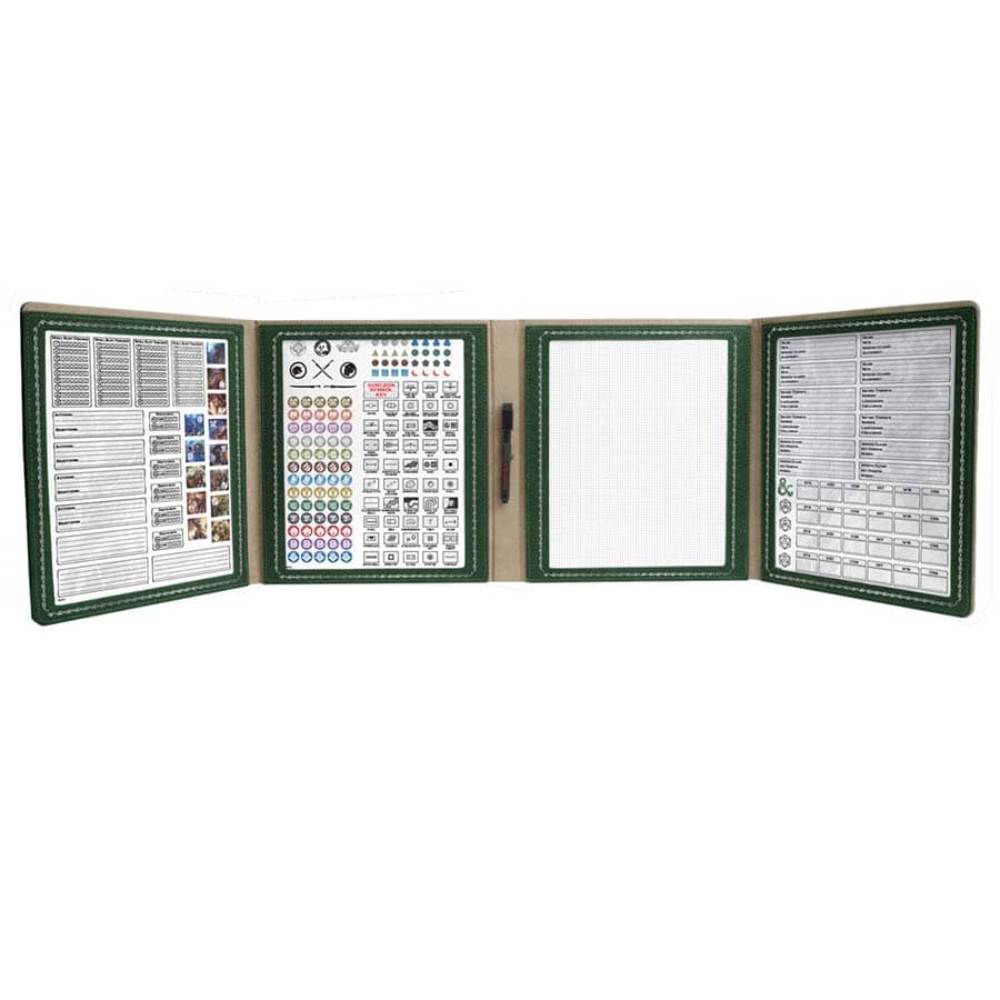 In need of some Greater Invisibility at the game table? Let all your DM decision-making Pass Without Trace behind the privacy of the Premium Dungeon Master's Screen for Dungeons & Dragons inspired by Drizzt and the Forgotten Realms! This premium leatherette tri-fold screen offers everything you need to run your campaign, and provides the perfect protection for hiding dice rolls, quick damage calculations, and upcoming ambushes from the rest of your team's prying eyes. Each of the four clear, write-on pockets on the inside of the screen is gusseted and holds up to 10 8.5'' x 11'' sized paper sheets, which can also be held in place outside the pockets with the 8 included initiative tracker clips. Use the clear plastic sheet of each pocket as a wet/dry-erase surface for tracking map movements, initiative order, or shop inventory lists with the included dry-erase marker! This officially licensed screen features a Sage Green and Brown pebbled leatherette exterior and soft light grey suede interior featuring an original map by Deven Rue of the Forgotten Realms with silver metal and foil accents, and sits perfectly flush on the shelf next to your other Ultra PRO Premium Source Book Covers. Includes four unique pages of static-cling reusable stickers to quickly build NPCs and dungeons, place enemies, and track status conditions. Measures approximately 42.77'' lengthwise when fully opened, with a height of 11.79''.