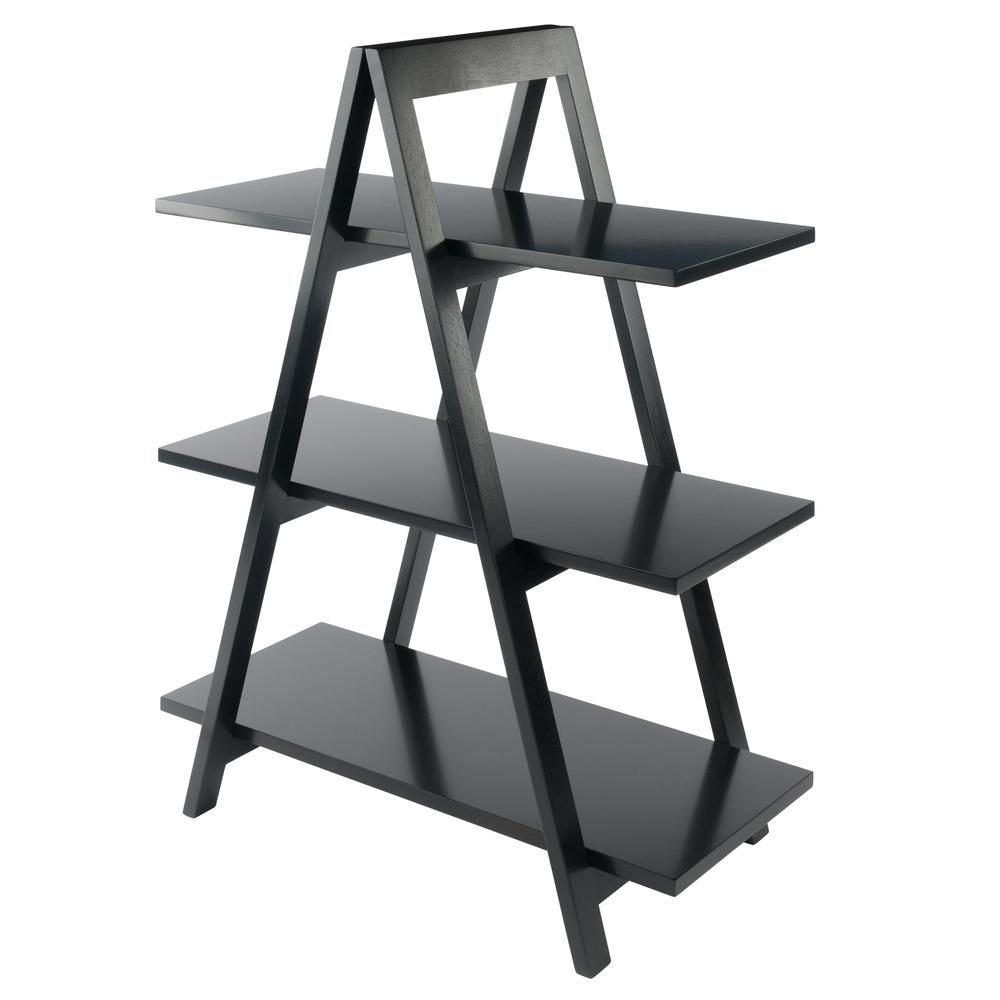 This eye-catching etagere from Winsome gets an ''A'' for style, stability, and storage. Ideal for apartment living or smaller spaces the Aaron A-Frame Shelf offers plenty of display and storage options for any room in your home. Take advantage of the three shelves in the living room for a favorite plant, books, and collectibles. Or use it as a utility shelf in the kitchen for keeping mixing bowls, herbs, dish towels, or other items you want to keep within easy reach. It's also a great organizing unit in the bathroom for extra towels and toiletries. The cool, contemporary styling and sleek Black finish is a striking combination that will look at home in any room. The frame is made of Solid Wood with MDF shelves that each hold a static weight of 50 lbs. Conveniently packed and shipped in 1 box, that includes the hardware needed for assembly. Overall size: 30.12''W x 15.28''D x 38.39''HShelf dimensions: 30.12''W x 12.13''D Distance between shelves: 11.97''H Assembly requiredShips in 1 box