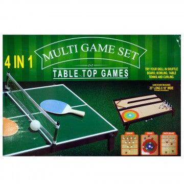 Great for parties, playrooms and limited spaces, this 4 in 1 Tabletop Multi-Game Set features a two-sided game board with legs for easy use on tables. Try your skills in shuffleboard, bowling, table tennis and curling all with one game set. Includes 2 table tennis balls, 2 paddles, 1 net, 10 mini bowling pins, 10 pucks and a reversible game board. Game board measures approximately 23" long x 14" wide. Instructions included. Box measures approximately 26" x 2.25" x 18".
