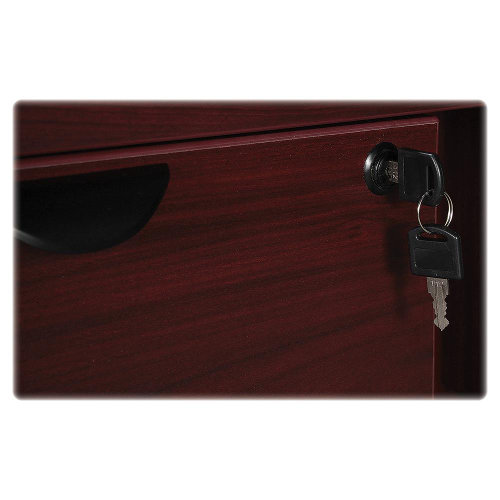Left-pedestal desk is part of the elegant, Lorell Prominence 2.0 Series that is perfect for your executive office. Pair with single-pedestal desks, returns and bridges to create L-shaped and U-shaped configurations. Durable, Mahogany laminate surface is mar-resistant, burn-resistant and impact-resistant to withstand daily work life. The 1'' thick top with matching 3mm edgebanding is made with 45 lb. density particleboard and finished on both sides with high-performance, thermally fused melamine. The 60'' wide desk features a full modesty panel for privacy, two grommets in the top, and a full pedestal with locking drawers to secure files and supplies. Pedestal includes two box drawers for supplies and one file drawer for letter-size or legal-size hanging files with included hangrails. Box and file drawers have 100 lb. full-suspension, ball-bearing slides. The 3/4'' adjustable glides allow desk to remain level on uneven surfaces. Desk ships fully assembled so it's ready for immediate use.