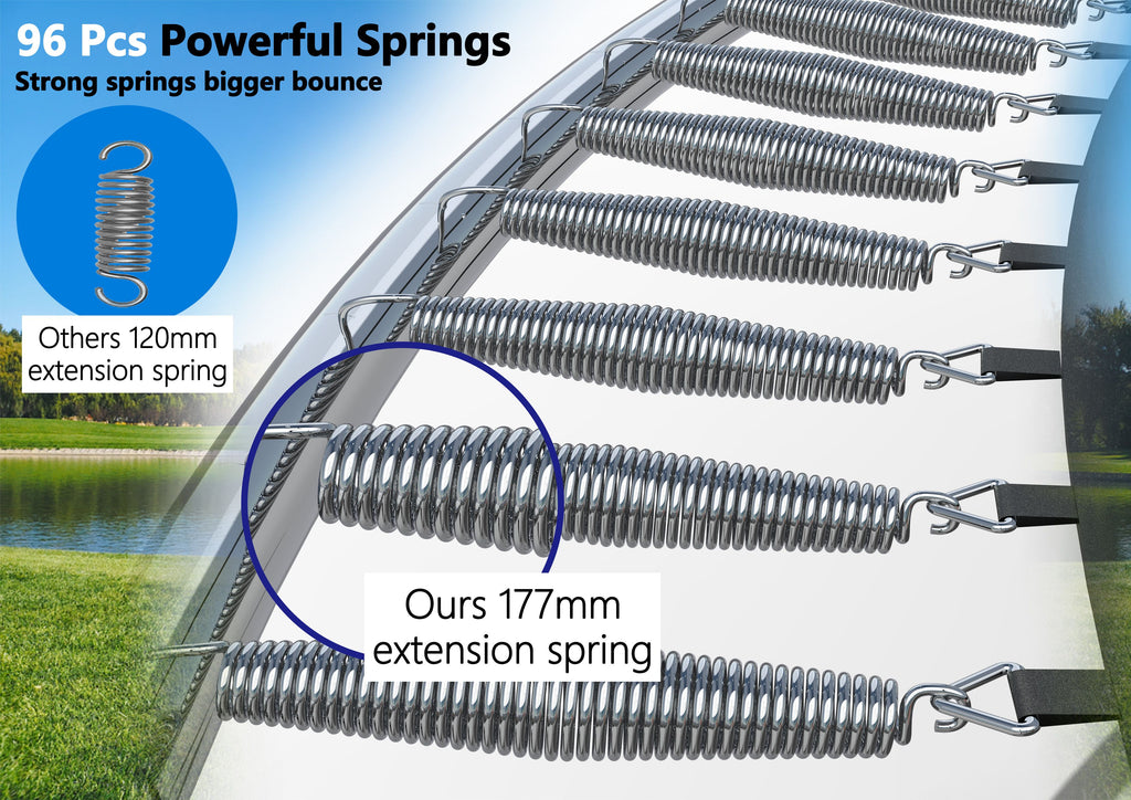Balance Bar Design: Unique 6 balance bar plus 6 W-shaped legs provide double stability. In addition to the 6 w-shaped legs to evenly support the frame of the trampoline, our upgraded 16 FT trampoline is also specially designed with 6 balance bars to connect every legs, which provide a more even force to make trampoline more stable and prevent trampoline poles from bending or even breaking. Double stability, double security