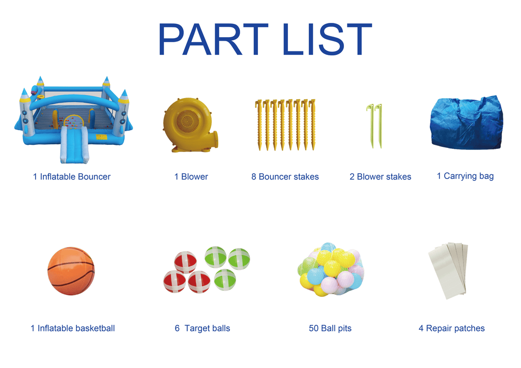 Use of space: lawn soft ground. The use of the process is shown in the following chart (the manual has a detailed analysis): the trampoline flat - - long air cylinder tied to the blower (inlet cylinder) - - the short air cylinder (outlet cylinder) tied to the blower - - open the blower - - the castle with the auxiliary package of large earth nails fixed on the lawn - - start using (strictly prohibited windy days and rainy days).