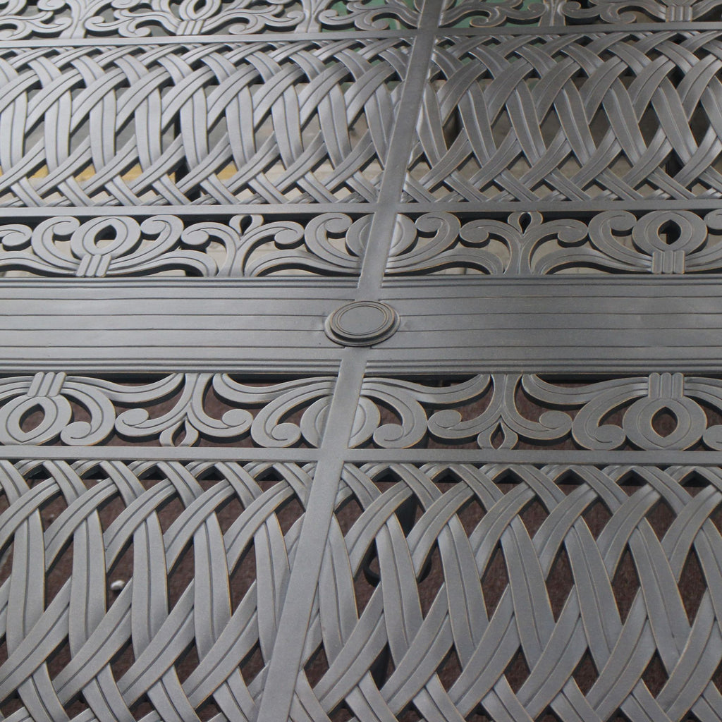 - Inspired by the elegant sensibilities of French Quarter architecture; this cast aluminum 44x84" Rectangle Table flawlessly combines expert craftmanship and intricate details. The Geneva Collection showcases a beautiful Tulip pattern which symbolizes perfect love that will last forever; A feeling that will be shared with this collection for years to come.