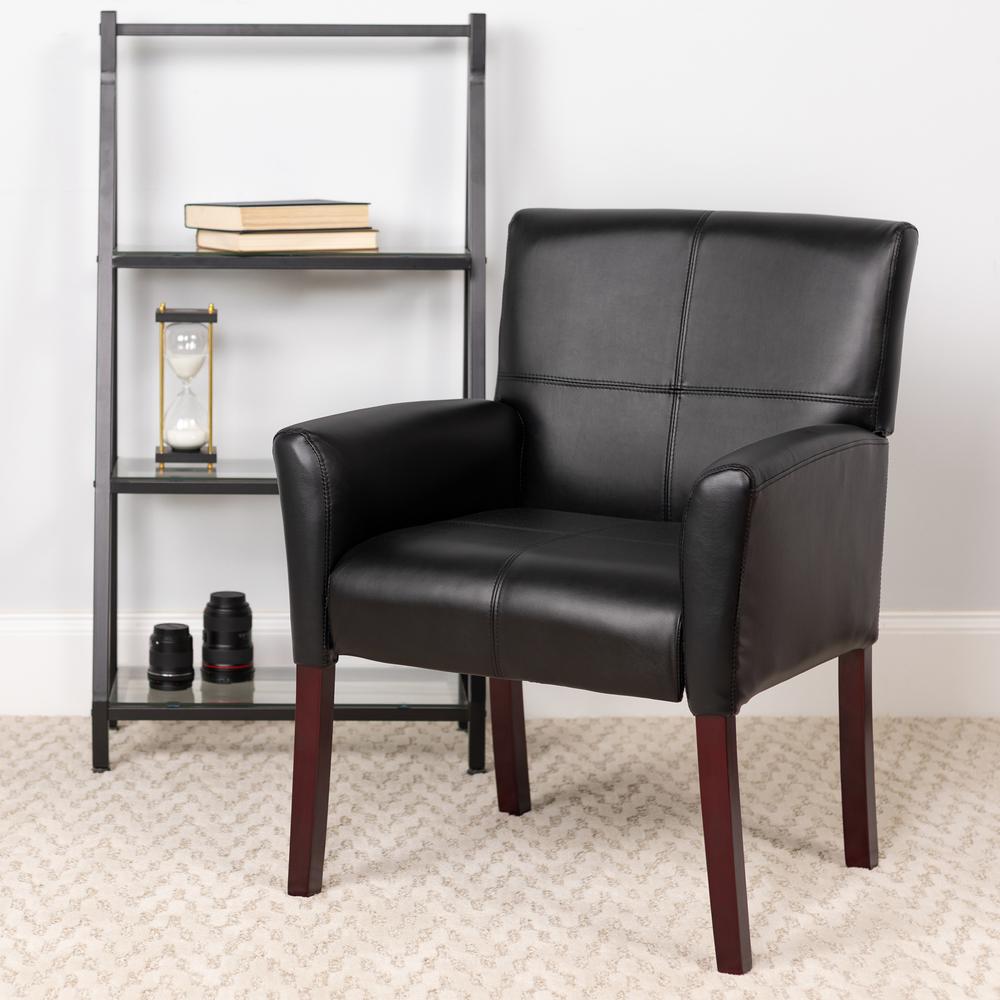 Welcome guests into your business with this gorgeous side reception chair that can be custom embroidered. Place several wooden guest chairs around a round conference table in the office to hold meetings away from the desk. No office, no problem, make a conversational setting off your living room or in that empty room near the entrance, the design pairs well with glass and wooden tables. Fit for any space, this guest chair serves as a comfortable waiting room chair, lobby chair, or office chair. Box stitch upholstery on the back and seat add a refined appearance. High wooden legs finished in a mahogany stain appeal to contemporary and traditional settings. Add sophistication to your office or home with a pair of black LeatherSoft guest chairs. This classically styled side chair will never go out of style, making it a great option for planning for the future of your business.