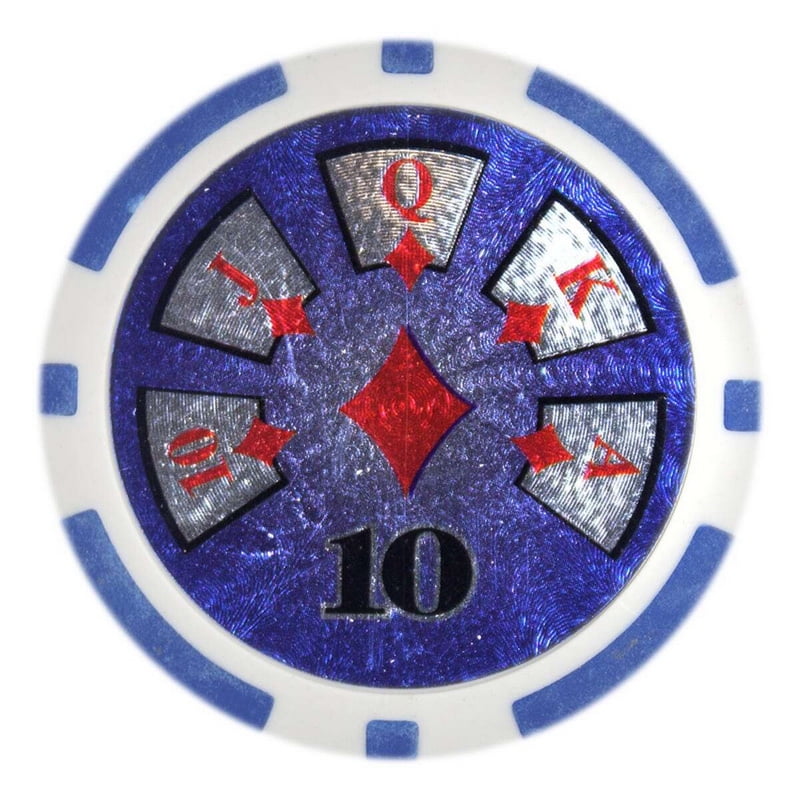 These 14 gram Monte Carlo clay poker chips will bring the look and feel of a casino card room to any home game. A unique and attractive edge design surrounds an inlay that displays the denomination of each chip, the words "Monte Carlo Poker Club", and a dazzling laser graphic strip that makes these chips sparkle and shine. These chips are eye-catching as well as classy.