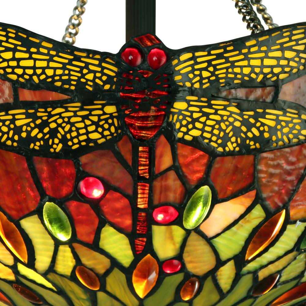Empress is a beautiful dragonfly-style semi-flush pendant, featuring stained glass that will cast a warm glow for your home. It is made up of 264 pieces of copper-foiled, stained art glass, 24 glass beads and 54 glass crystals, expertly designed and crafted by hand. Each of CHLOE's Tiffany-style stained glass products are formed using the very same techninique developed by Louis Comfort Tiffany in the early 1900's, using hand cut stained art glass, each wrapped in fine copper foil and soldered together at extremely high temperatures to form each unique piece. Exact size to the nearest inch may vary, and exact color of each glass piece may vary due to each piece being hand crafted. First image is with the light shining through, second image is with no light. Dry listed and recommended for an indoor setting.