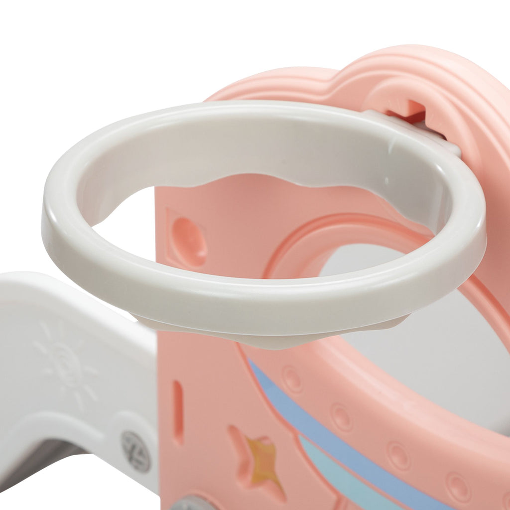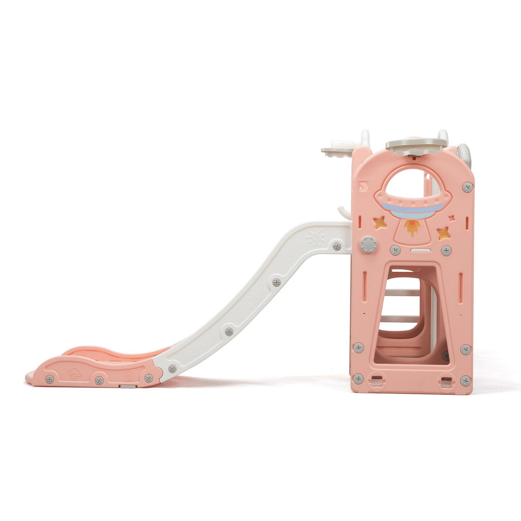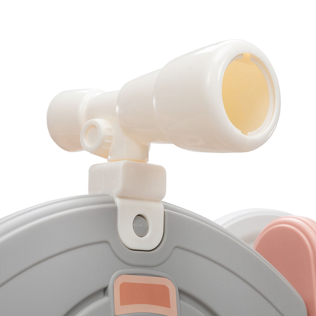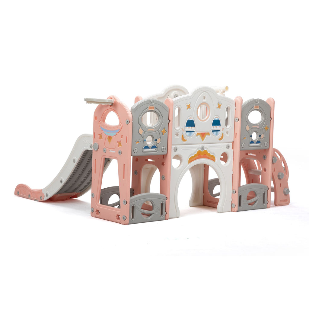 [Kids Activity Center]: Including a top aisle, a slide, a climber, a bottom tunnel, a telescope, 2 basketball hoops, 2 balls, rings, and 2 storage spaces, this toddler playground creates an indoor multifunctional amusement park to foster kids' imagination, hand-eye coordination, and creativity.