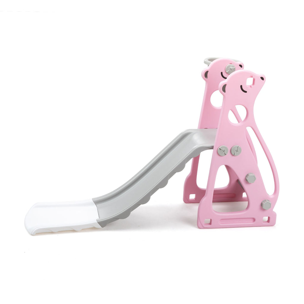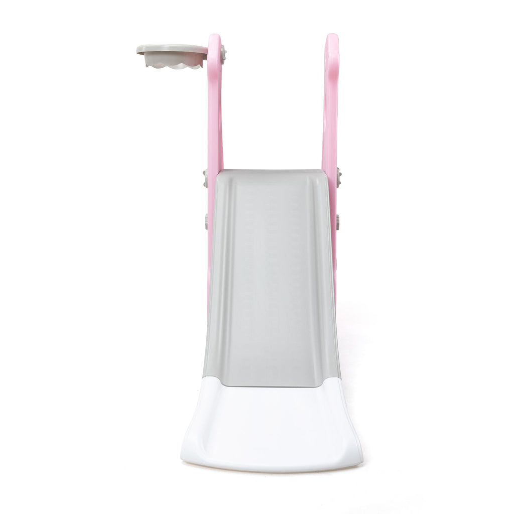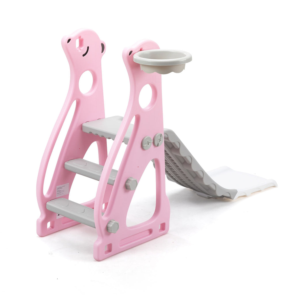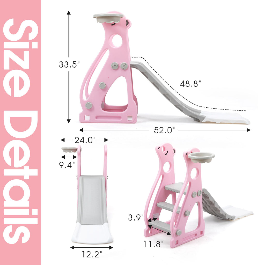 Features:[Multi-functional Kids Slide]: With a cute and pretty appearance, the kids slide allows your kids to slide, practice basketball shooting and climbing.[Premium Material]: Made of premium and kid-friendly PE, this slide for toddlers is durable for long-time use.[Stable Structure]: The slide for kids is designed in triangle, ensuring the stability and promoting kids' safety while playing .[Gentle Sliding]: In order to make your children slide flatly, there is a gentle slope and an extended slide.[Amazing Kids Gift]: Amusing your children, the toddler slide will be a wonderful gift for kids on their birthdays and other holidays. Specifications:Color: Gray+PinkMain Material: PEOverall Dimensions: 52"L x 24"W x 33.5"HWidth of the Slide without Basketball Hoop: 14.6"Gray Slide Dimensions: 33.9"L x 12.2"WWhite Slide Dimensions: 15"L x 12.2"WGray Step Dimensions: 11.8"L x 3.9"WLength of Pink Side Board: 16.9"(long); 6.5"(short)Height of Pink Side Board: 12.2"Weight Capacity: 44.1 lbsSuitable Age: 6-72 months oldNet Weight: 7.9 lbs