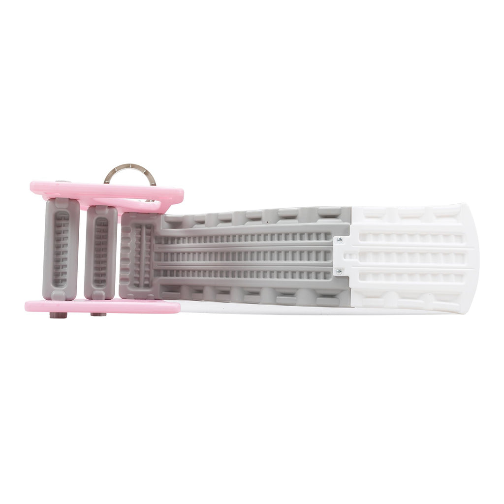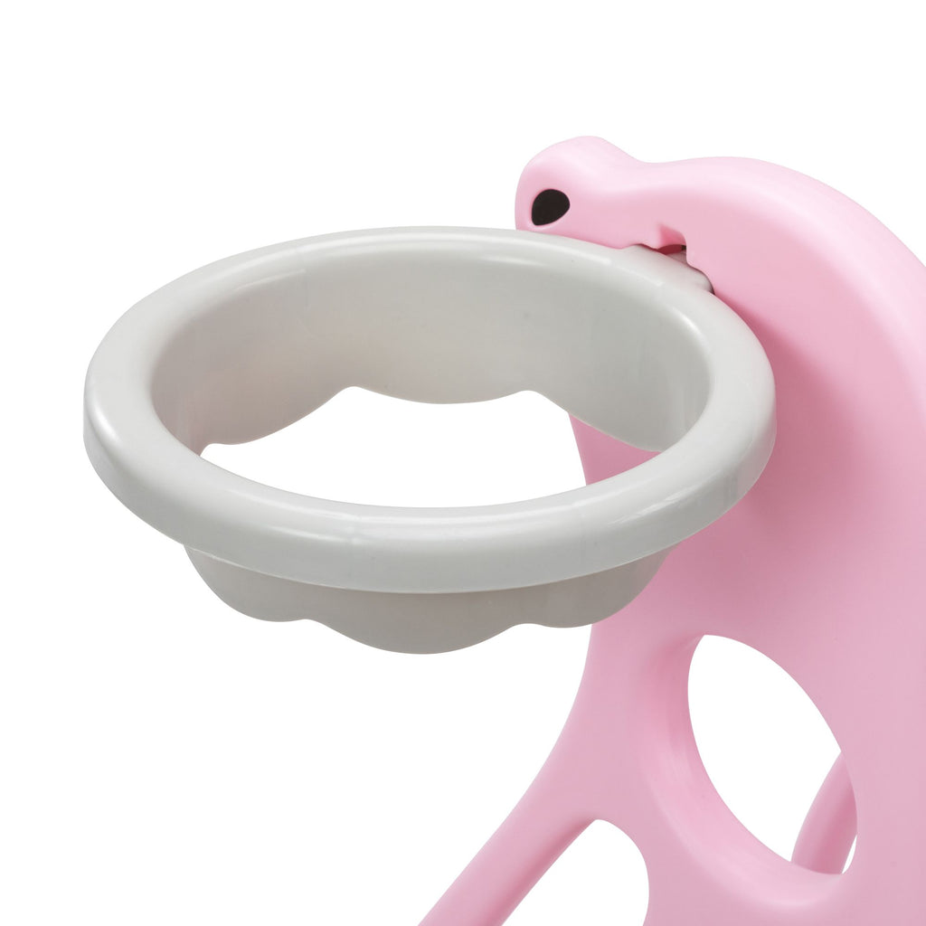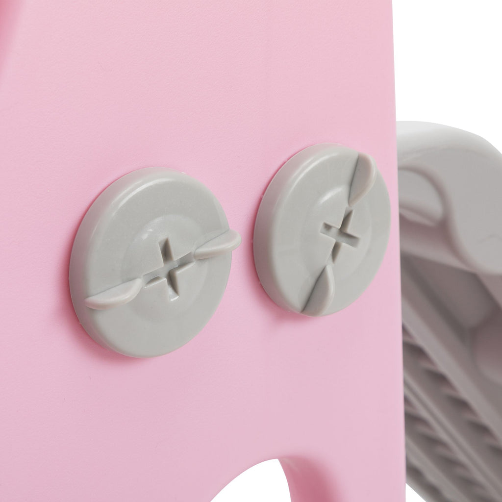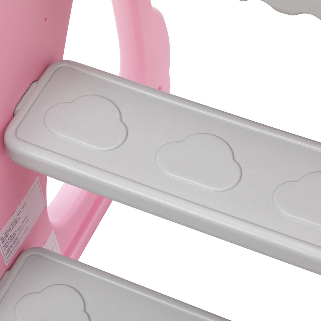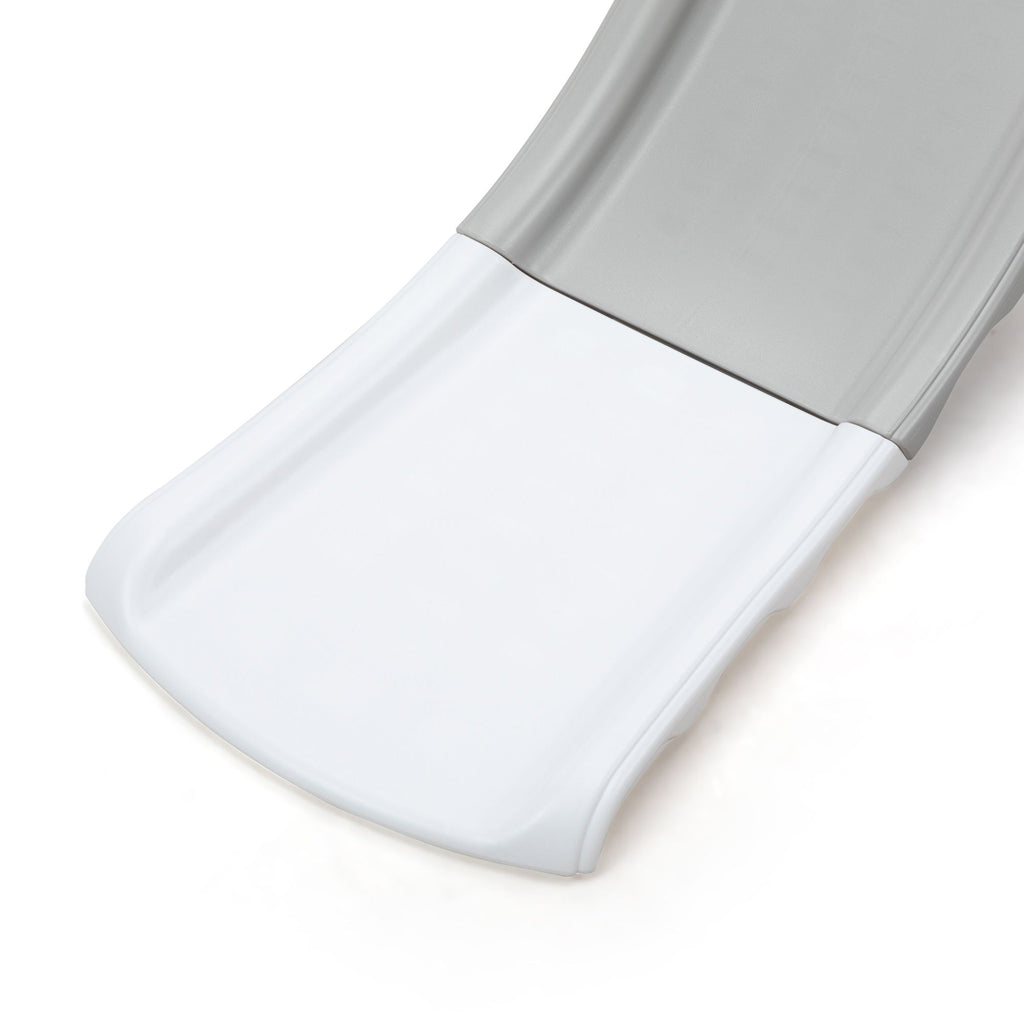 Features:[Multi-functional Kids Slide]: With a cute and pretty appearance, the kids slide allows your kids to slide, practice basketball shooting and climbing.[Premium Material]: Made of premium and kid-friendly PE, this slide for toddlers is durable for long-time use.[Stable Structure]: The slide for kids is designed in triangle, ensuring the stability and promoting kids' safety while playing .[Gentle Sliding]: In order to make your children slide flatly, there is a gentle slope and an extended slide.[Amazing Kids Gift]: Amusing your children, the toddler slide will be a wonderful gift for kids on their birthdays and other holidays. Specifications:Color: Gray+PinkMain Material: PEOverall Dimensions: 52"L x 24"W x 33.5"HWidth of the Slide without Basketball Hoop: 14.6"Gray Slide Dimensions: 33.9"L x 12.2"WWhite Slide Dimensions: 15"L x 12.2"WGray Step Dimensions: 11.8"L x 3.9"WLength of Pink Side Board: 16.9"(long); 6.5"(short)Height of Pink Side Board: 12.2"Weight Capacity: 44.1 lbsSuitable Age: 6-72 months oldNet Weight: 7.9 lbs