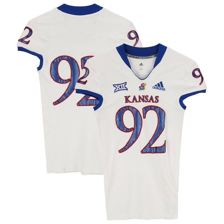 Kansas Jayhawks Team-Issued #92 White Jersey from the 2018-21 NCAA Football Seasons
