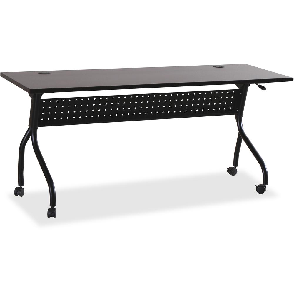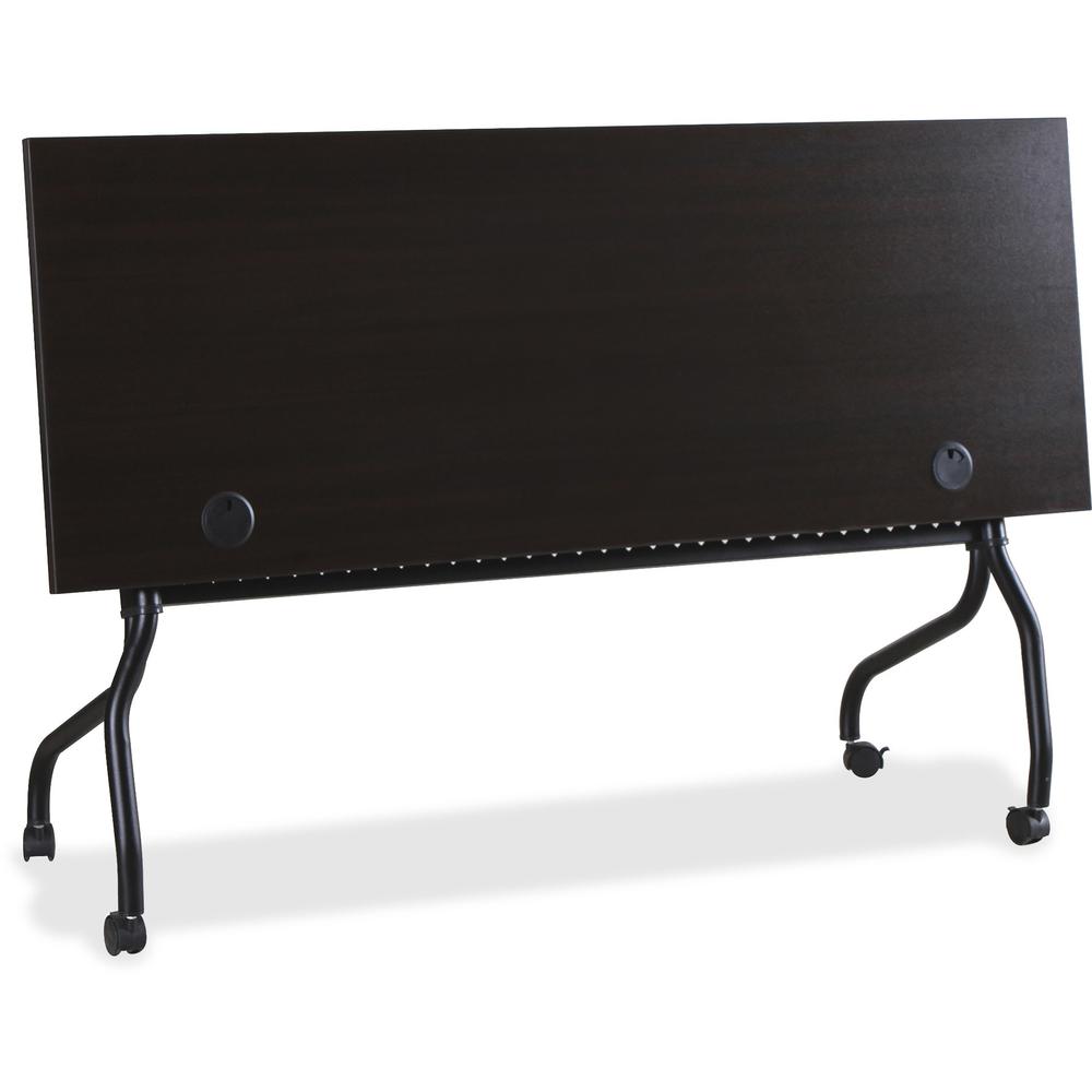 Part of the Lorell Preference Series, this versatile training table offers flexible configurations and convenient storage. Use individually or secure together into rows with a reliable metal connector (sold separately). Espresso top flips up for easy storage without having to remove the connector. Top features a melamine surface with a 3mm PVC straight edge. Two grommets allow easy cord management. Four-leg, all-metal black base features a one-way fold and modesty panel. Table rolls easily on four nylon casters with brakes.