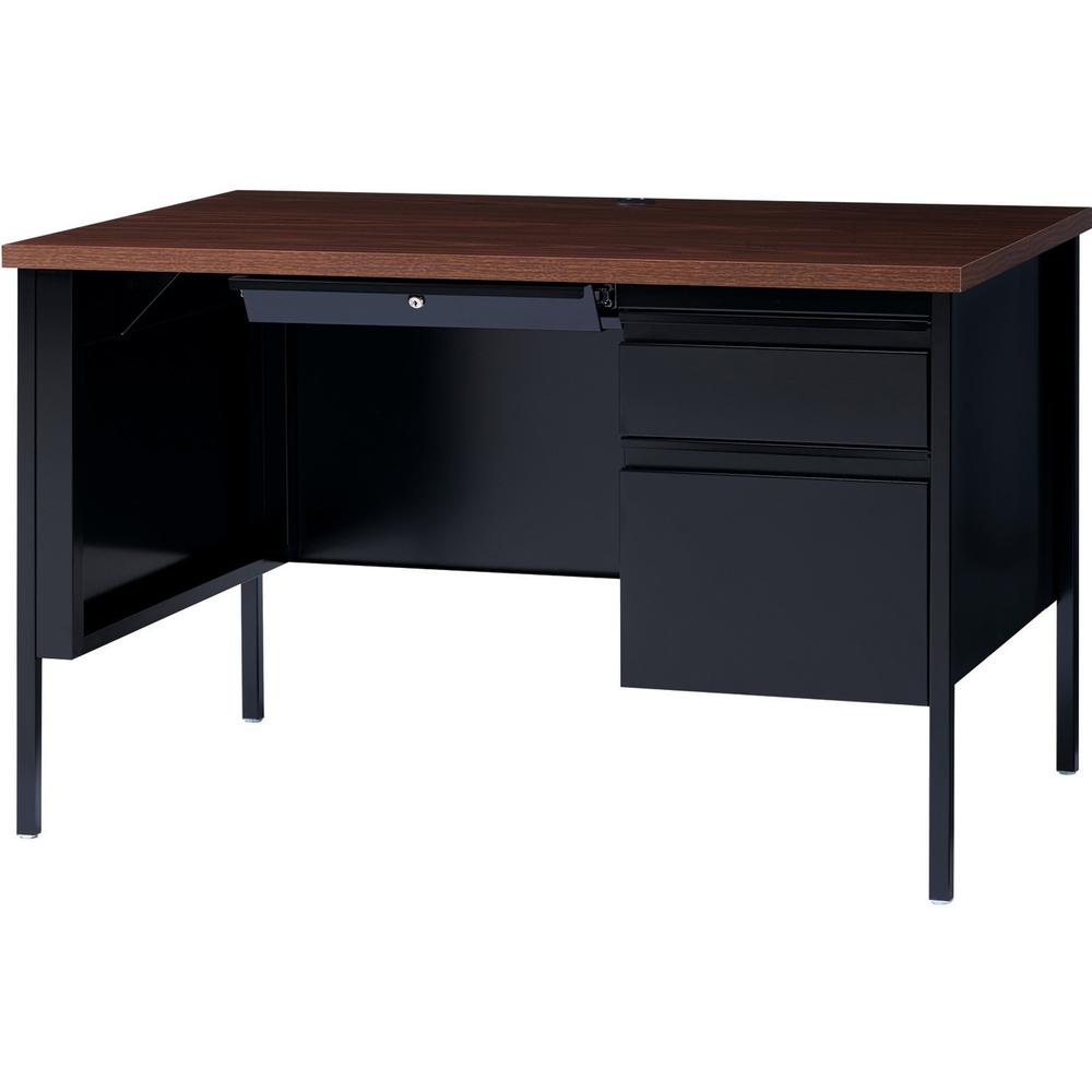 45-1/2'' wide single-pedestal desk is part of the Lorell Fortress Series, a practical and professional desk solution ideal for business, government and educational offices. Use this right-pedestal desk with a Fortress left return for L-shaped configurations. Both have 3/4-height modesty panels for seamless lines. Durable, high-performance steel construction stands up to rigorous daily use. The 1-1/8'' thick top with square edges features a Walnut laminate surface that is scratch-resistant, stain-resistant and water-resistant. Design also features a box/file pedestal on the right. Both drawers lock and offer full-extension, ball-bearing slides and full-width, integrated drawer pulls. File drawer accommodates letter-size files. Central-locking center drawer features a core-removable lock. Center grommet allows easy cord management. Reinforced, double-frame inner structure keeps desk solid and sturdy for years of use. Steel desk in black meets or exceeds ANSI/BIFMA standards.