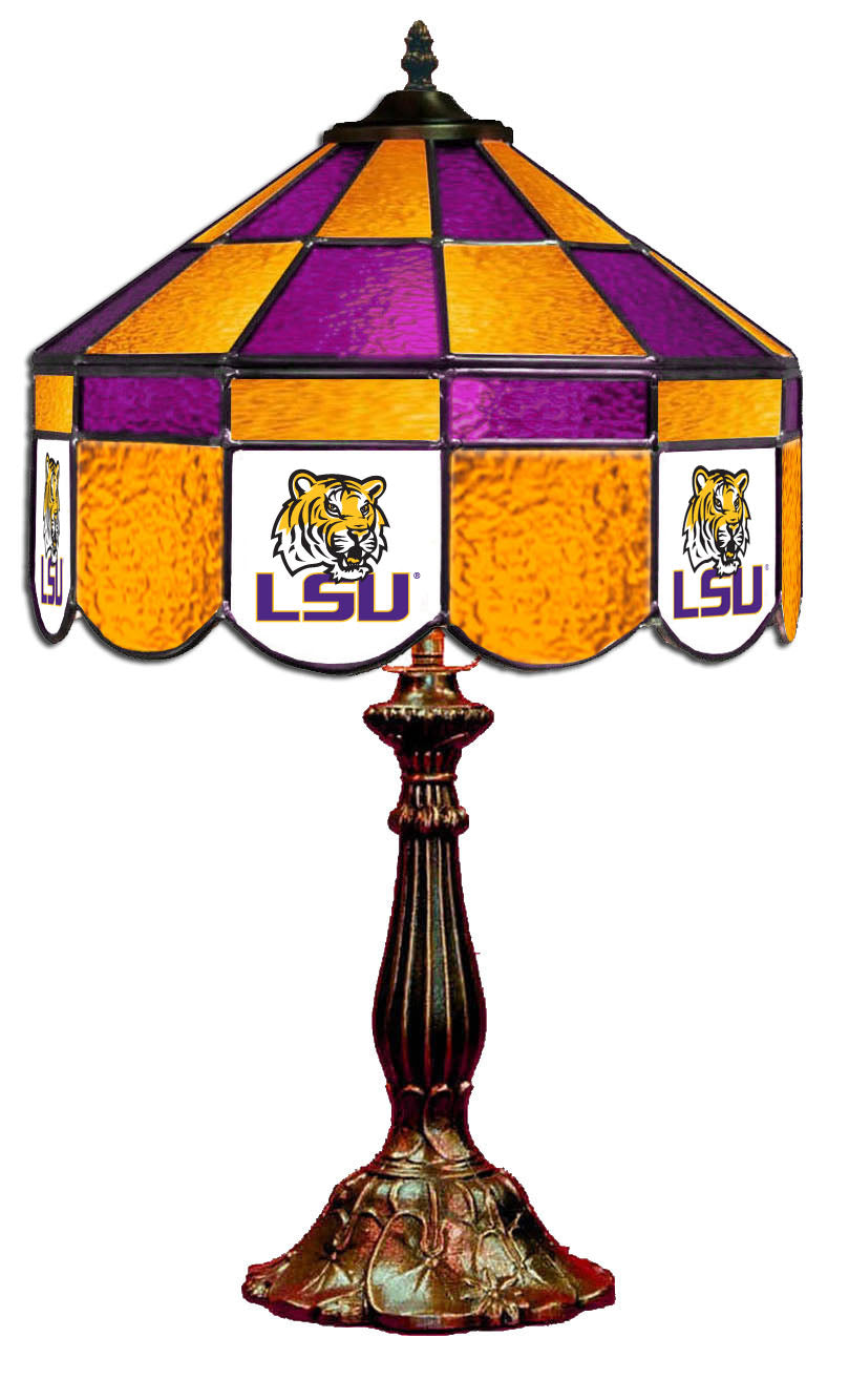 Decorate your gameroom with brilliant color, high quality stained glass lamps showcasing your favorite team.These collegiate Tiffany Style Stained Glass lamps, manufactured by All American Lamps, are created with the school's logos screen printed onto the glass. Their products use the same opalescent art glass that was used by Tiffany years ago. Each piece of glass is individually cut, leaded, and soldered together by hand with the same care and traditional workmanship found in those early works of art.We offer a large selection of different styles from small pool table lamps to full sized billiard lights as well as hanging lamps and table lamps big and small. We have several different logos to chose from. Something for every ones taste.The finished product is a beautiful, high quality lamp sure to delight any college fan.These stained glass lamps are available up to15 different styles to acommodate any decor or budget.