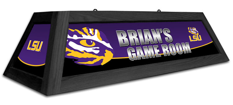 Add that special touch to your gameroom with our CUSTOM SPIRIT GAME TABLE LAMP! The traditional look of the hardwood frame will compliment your billiard table. While the bright backlit graphics will help to define the atmosphere of your game room. The frame is handcrafted from solid hardwood using tongue and groove joinery. The side and end panels boast vibrant backlit graphics printed on shatter resistant Duratrans acrylic. You can customize the lamp to replace the standard verbiage to personalize it. Some restrictions apply. The 42'' GAME TABLE LAMP provides up to 400 watts of illumination using compact fluorescent bulbs, or 260 watts using incandescent bulbs. Ceiling canopies and chain are included allowing for easy installation.