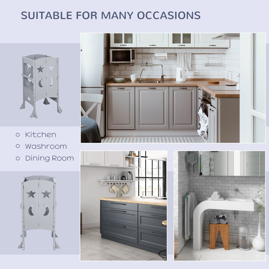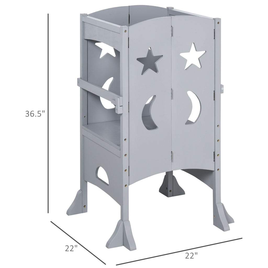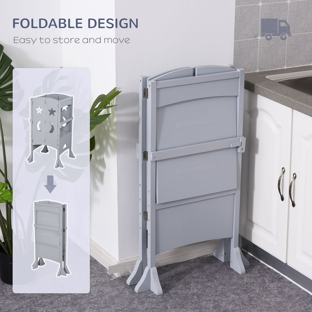 Wooden Kitchen Step Stool for Kids, Foldable Toddler Tower, Helper Stool for Kitchen Counter with Support Handles Safety Rail, Gray
