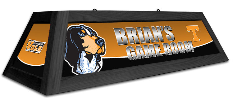 Add that special touch to your gameroom with our CUSTOM SPIRIT GAME TABLE LAMP! The traditional look of the hardwood frame will compliment your billiard table. While the bright backlit graphics will help to define the atmosphere of your game room. The frame is handcrafted from solid hardwood using tongue and groove joinery. The side and end panels boast vibrant backlit graphics printed on shatter resistant Duratrans acrylic. You can customize the lamp to replace the standard verbiage to personalize it. Some restrictions apply. The 42'' GAME TABLE LAMP provides up to 400 watts of illumination using compact fluorescent bulbs, or 260 watts using incandescent bulbs. Ceiling canopies and chain are included allowing for easy installation.