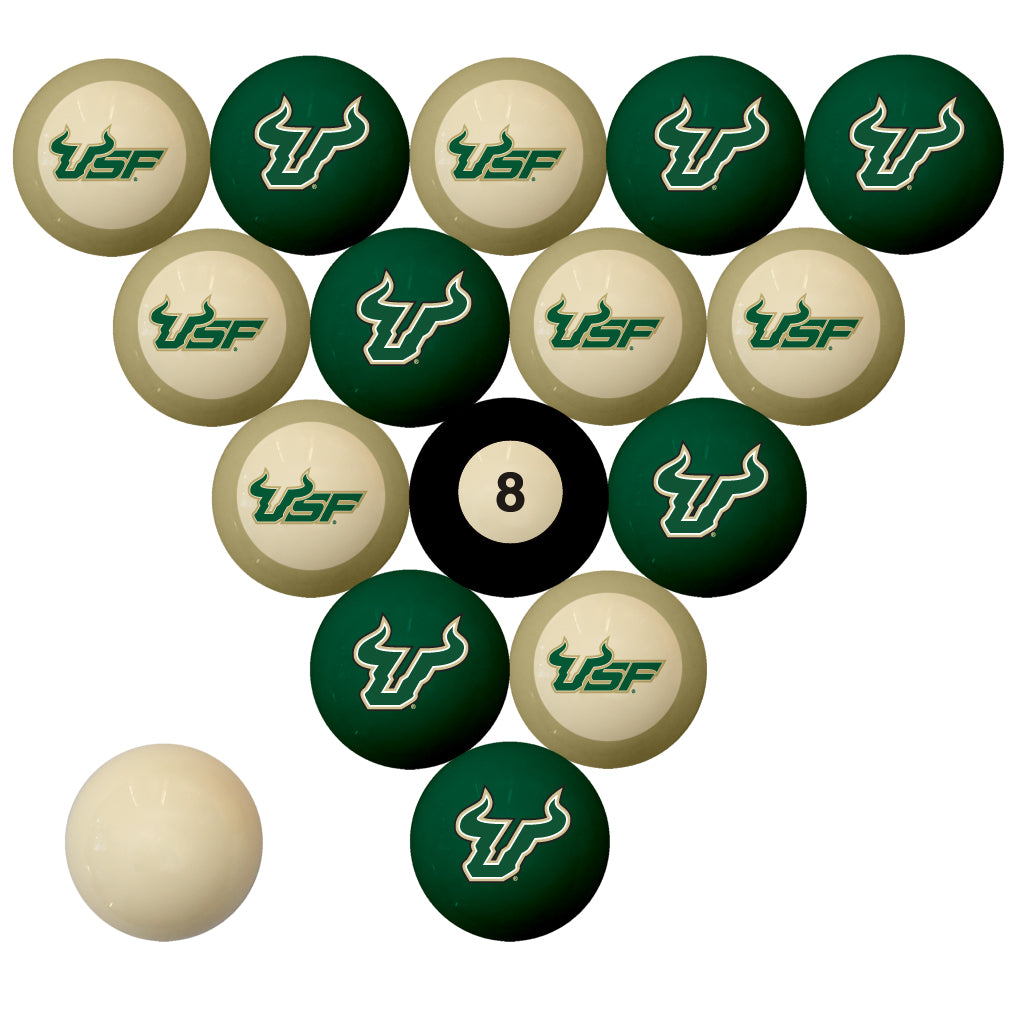 SOUTH FLORIDA SCHOOL COLOR NUMBERED BILLIARD BALL SET GREEN SOLID/GOLD STRIPE - USFBBS100N