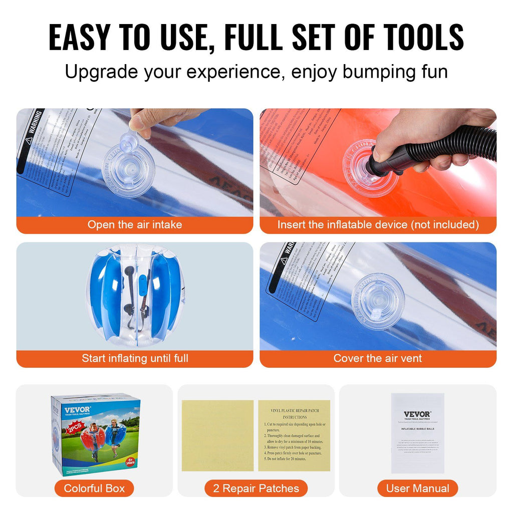1.High-quality Material, Endless Fun: Dive into endless bumping fun with VEVOR 2PCS Inflatable Bumper Balls! Crafted from 0.3mm thick, explosion-proof PVC, these sumo balls are durable, safe, waterproof, and built to prevent air leaks. Excellent tear resistance, advanced valve system and tight sealing promise long-lasting entertainment.