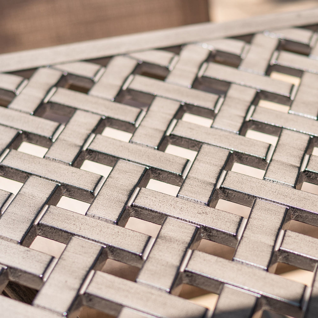 CONVENIENT FEATURES: The table features a beautiful lattice-patterned design on the top and a 2" umbrella hole for shade options, providing both style and functionality.