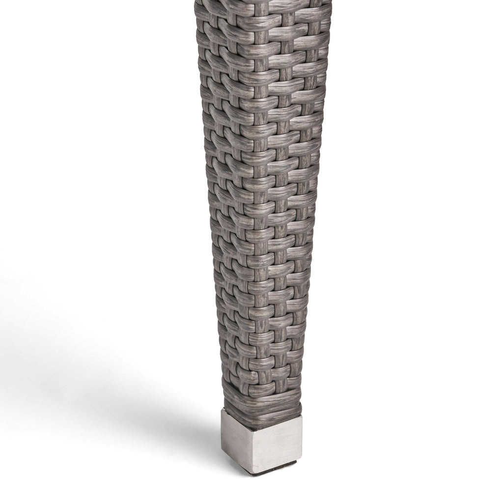 For a touch of bold texture, this design is wrapped in woven polyethylene wicker so it can stand up to natural damage from sunlight and rain. Pull up upholstered chairs all around and roll out a tassel-trimmed rug down below to craft a casual dining space by the pool, perfect for gathering the kids for snacks after swimming or taking Sunday morning brunches outback.